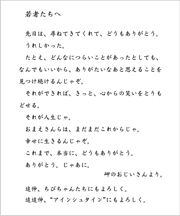 「“地球上で暮らしておる者”と“宇宙から地球を眺めておる者”、 ──果たして、どちらが、地球をよく見ておると言えるじゃろうかのぉ?」